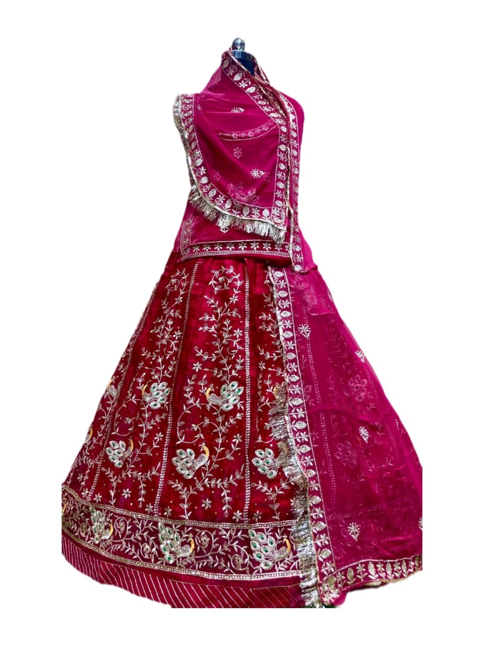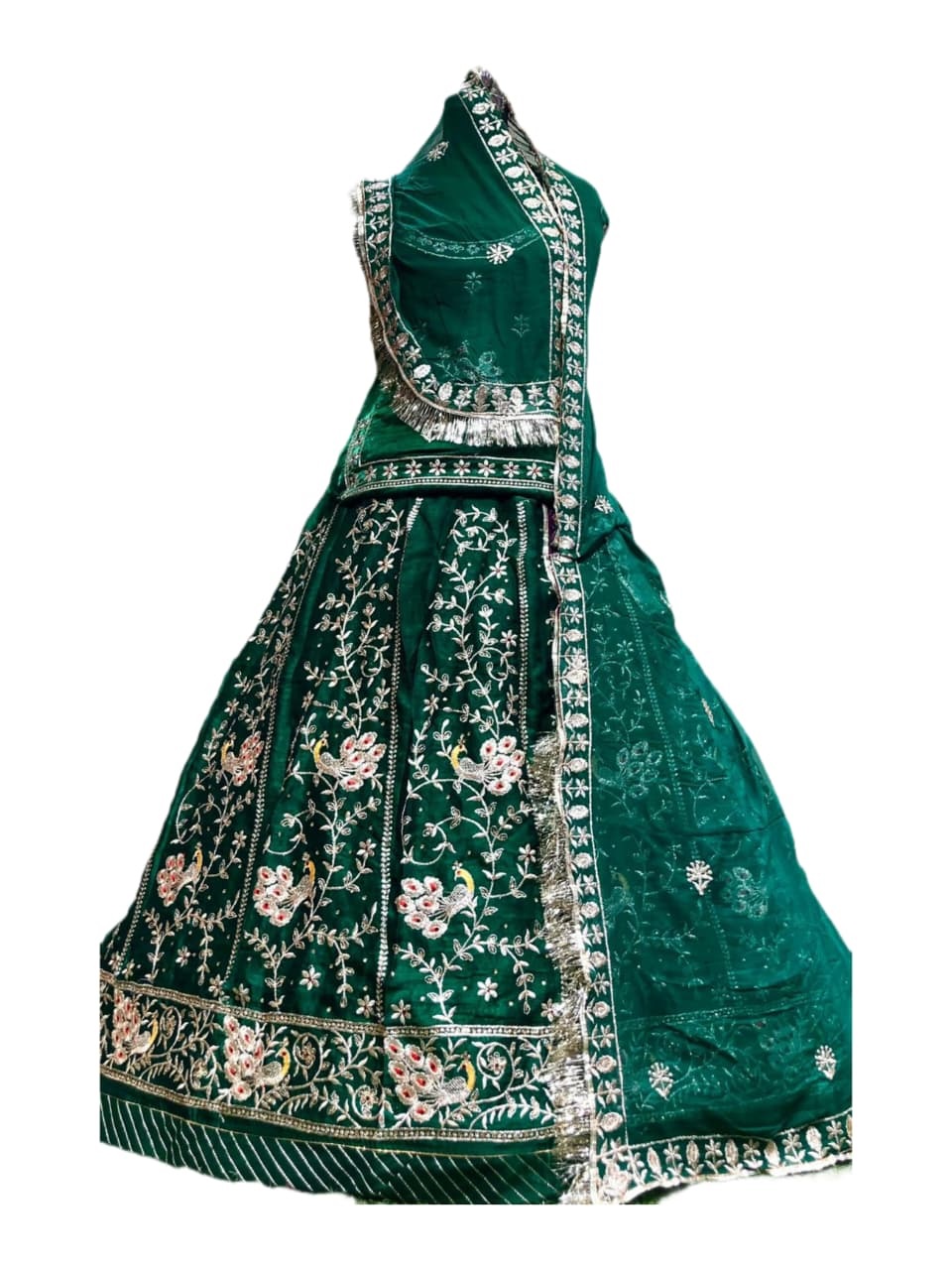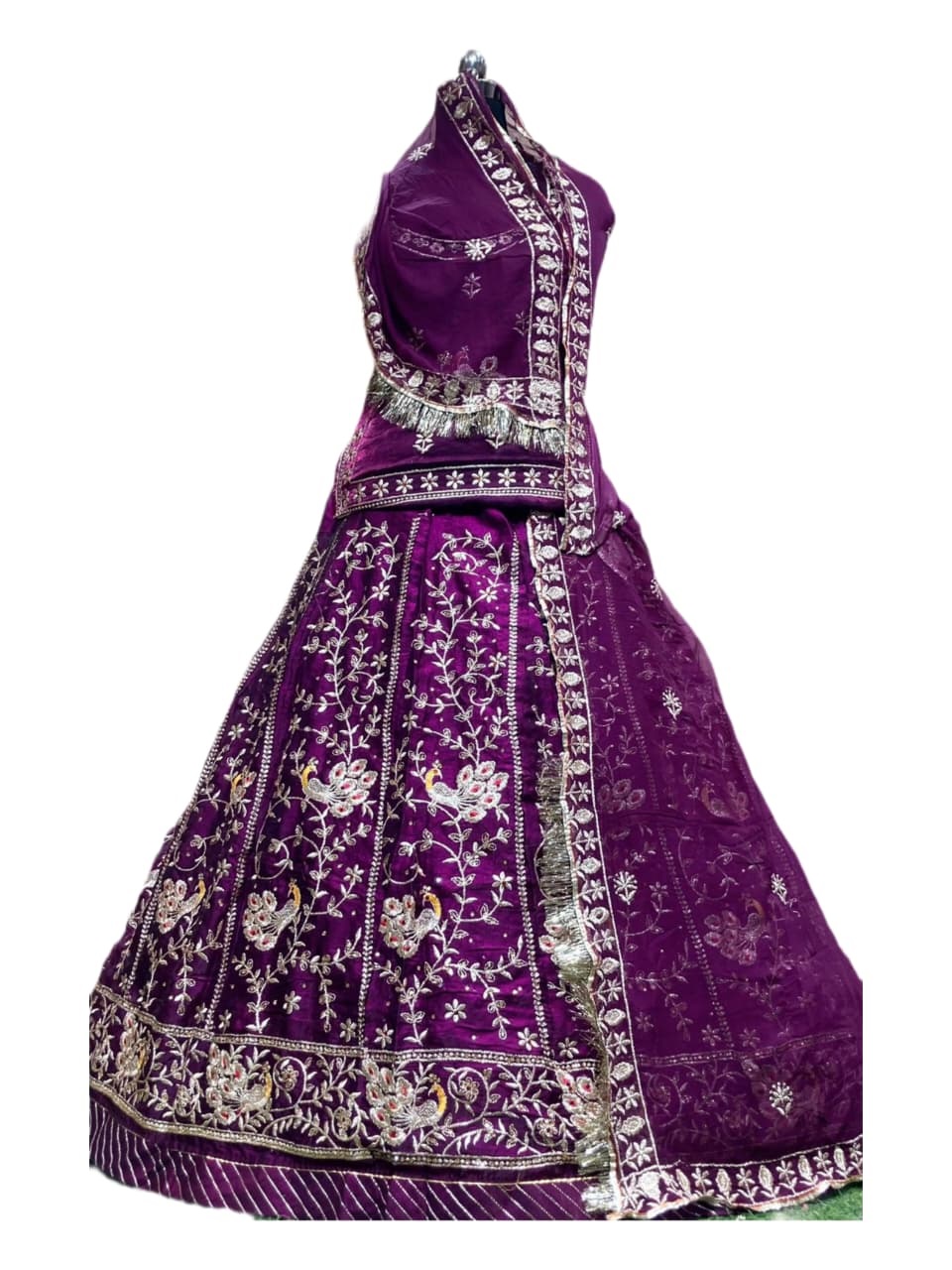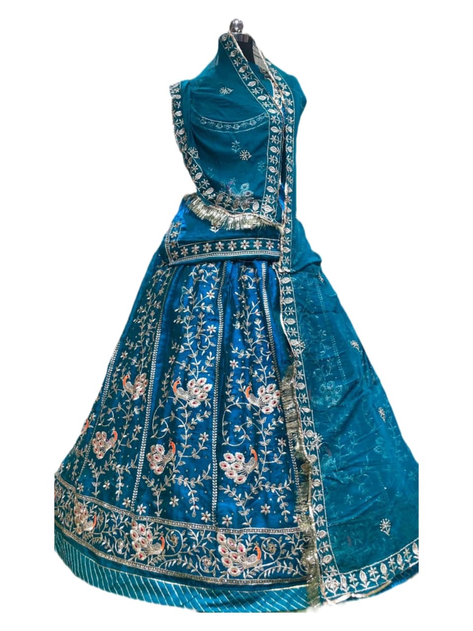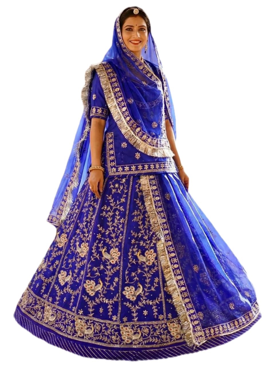This exquisite ensemble belongs to the premium category of Rajputi Poshak and Rajasthani Poshak, inspired by the rich cultural legacy of Rajasthan. The deep blue color symbolizes elegance and royalty, making it an excellent choice for special wedding occasions. The full jaal design enhances the richness of the outfit, giving it a luxurious and grand appearance suitable for traditional family functions.