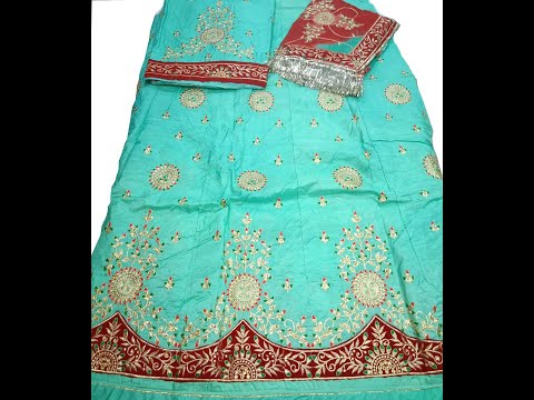 This firoji blue poshak is made with the upada silk lehenga and kurti kanchali and hamrahi pure odhani. There is golden, red and green thread embroidery work done on the lehenga and kurti kanchali. Odhani is also done with full jaal work.