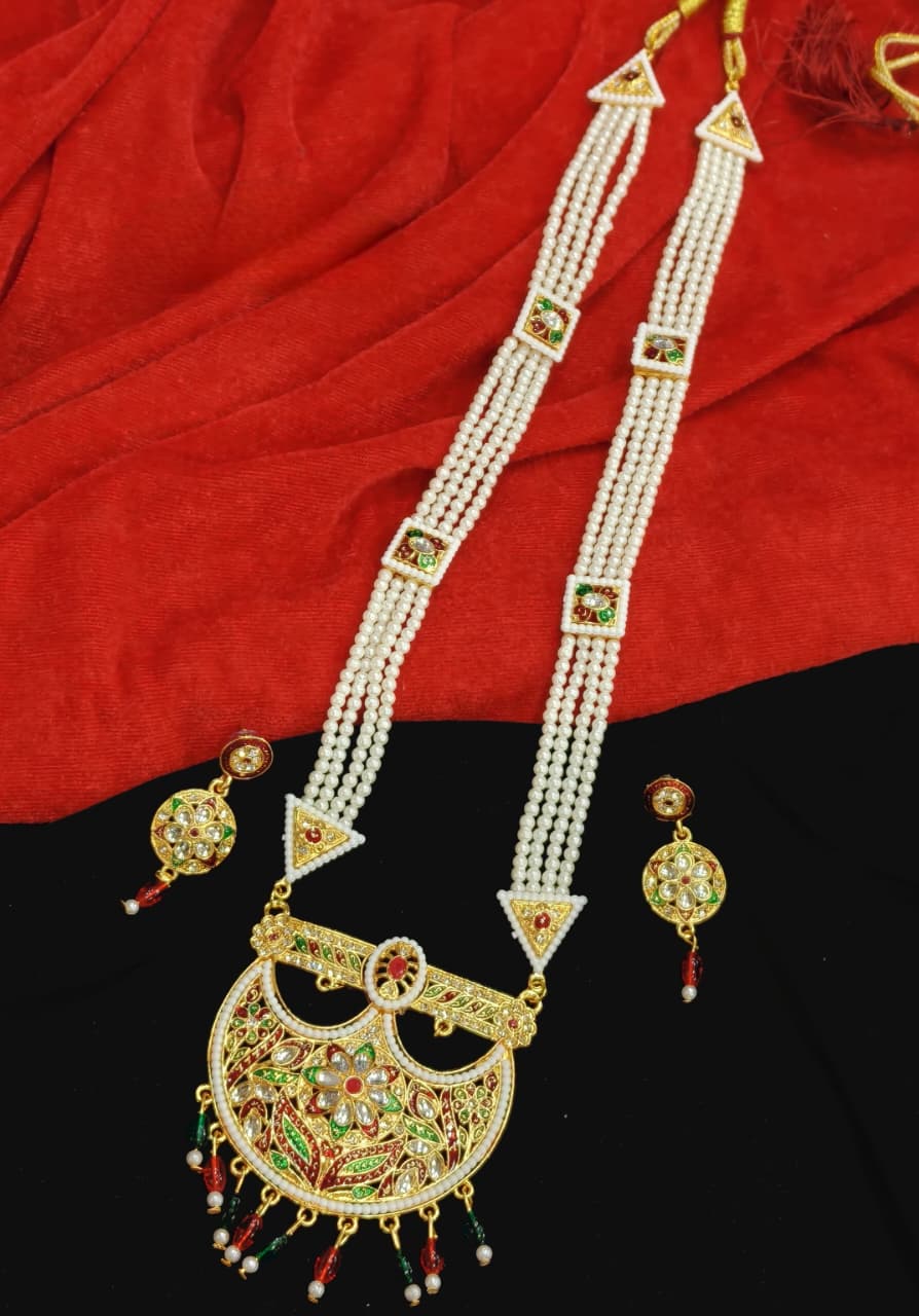 Celebrate the vibrant royal heritage of Rajasthan with the Marwadi Rani Haar with Multicolor Stones, a stunning Rajputi Rani Haar designed to reflect traditional elegance and festive charm. This beautifully crafted Rajasthani long necklace set combines classic pearls with colorful stones, creating a majestic jewelry piece perfect for weddings and cultural celebrations.