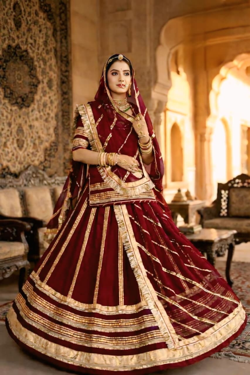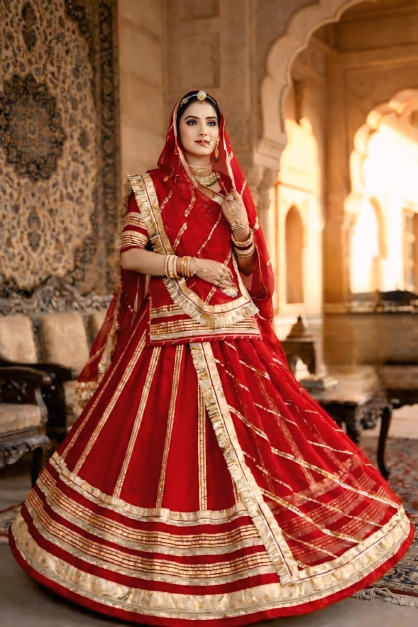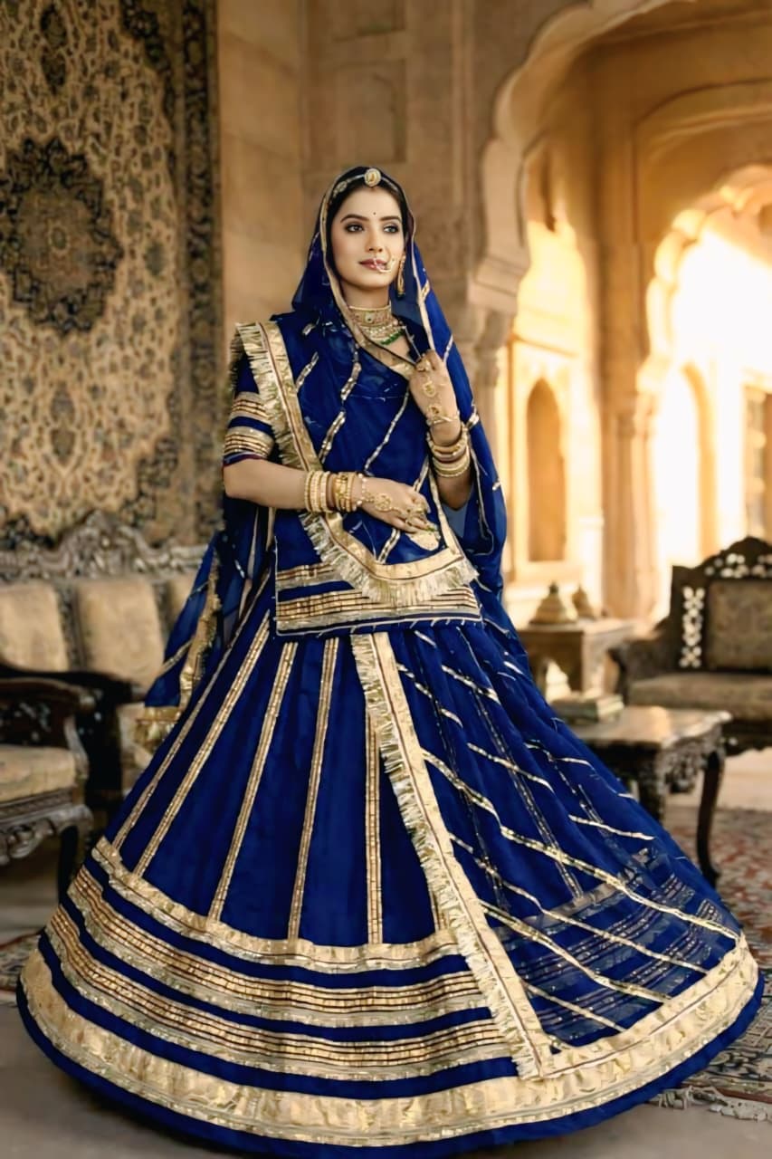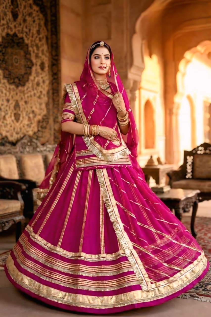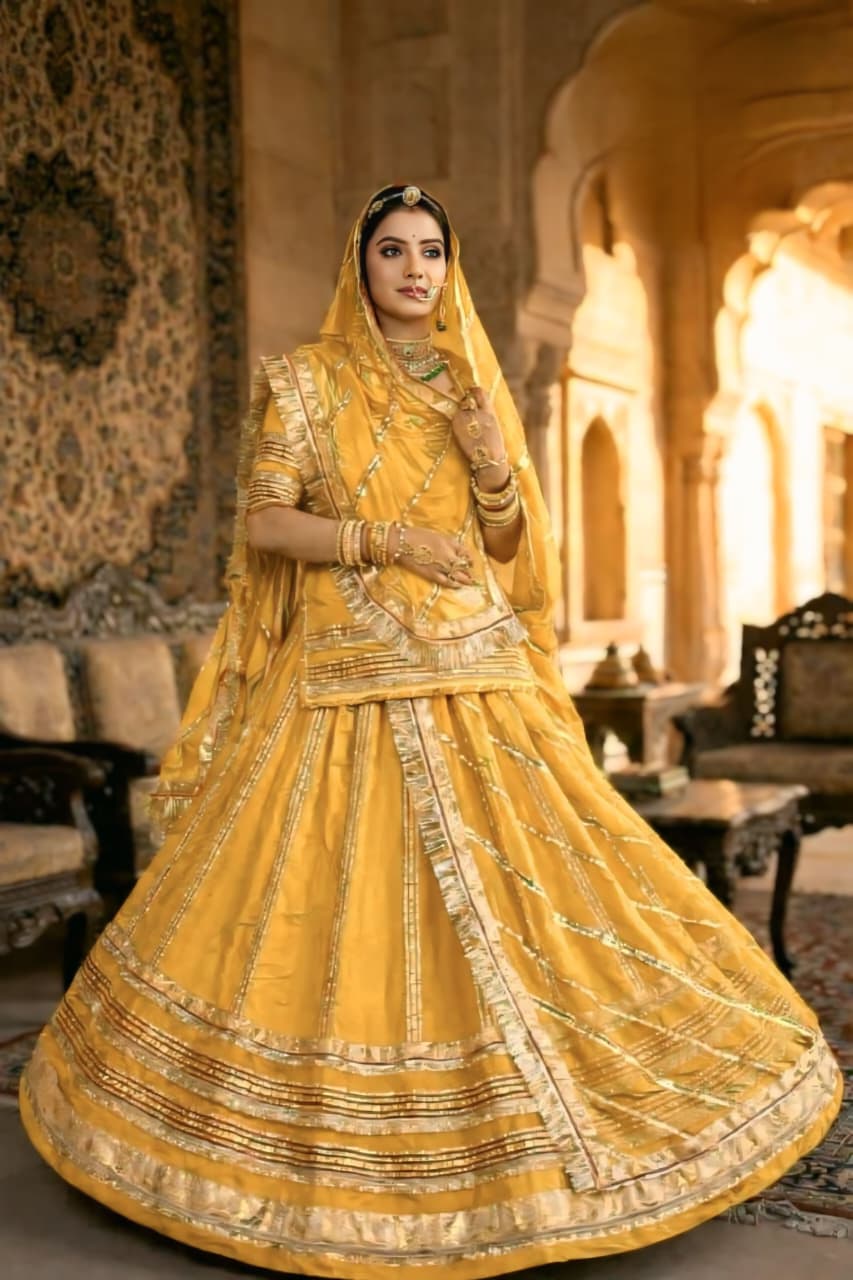 The highlight of this ensemble is the delicate lace (lappa and gota) and zari work that adorns the odhani (hamrahi). The intricate patterns and shimmering threads add a touch of traditional grandeur, showcasing the skilled craftsmanship of Rajasthani artisans.
