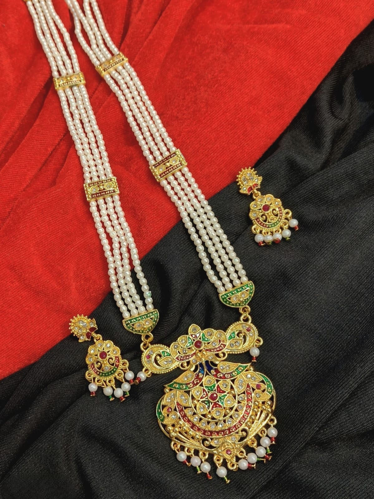 This Rajasthani Rani Haar features a new and elegant design combined with a graceful long necklace and decorative pendant. The carefully arranged white pearls create a clean and timeless look, while the updated design adds freshness to traditional Rajputi jewelry. It is an ideal piece for women who prefer a subtle yet royal appearance.