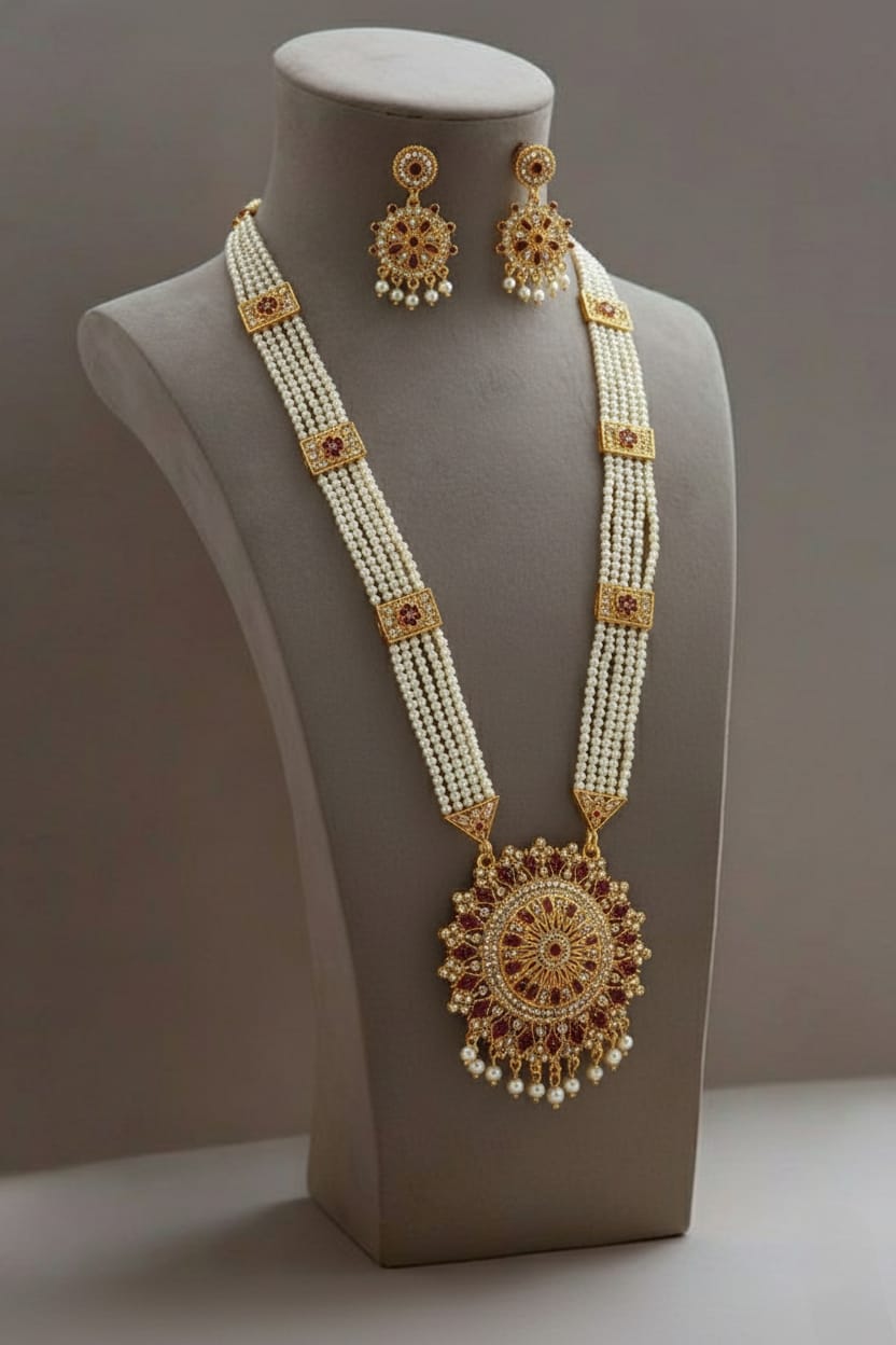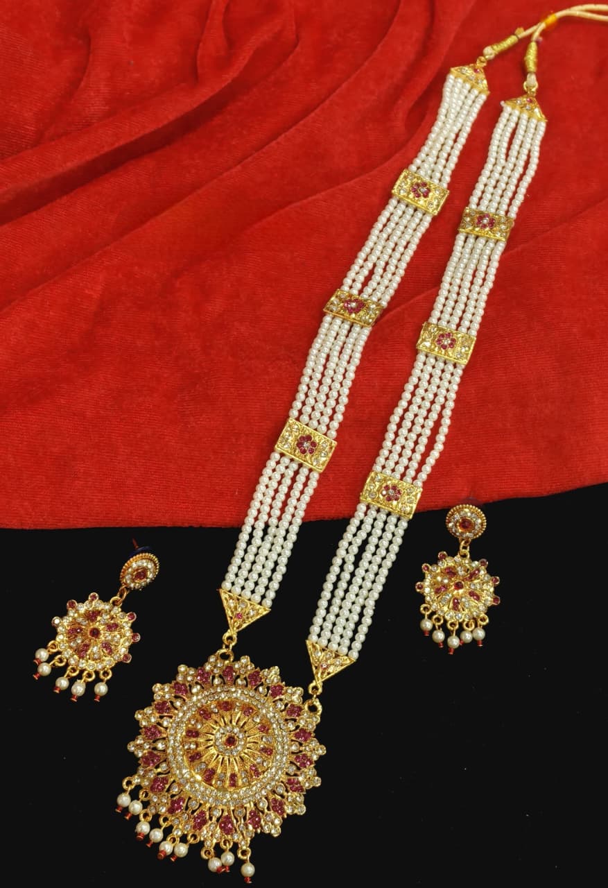 Enhance your traditional look with the timeless elegance of the Rajasthani Rani Haar with Round Pendant and White Pearl. Inspired by royal Rajputi jewelry designs, this Rajasthani long necklace set reflects grace, heritage, and cultural richness. The classic round pendant combined with white pearls makes this necklace a perfect choice for women who love traditional yet elegant jewelry.