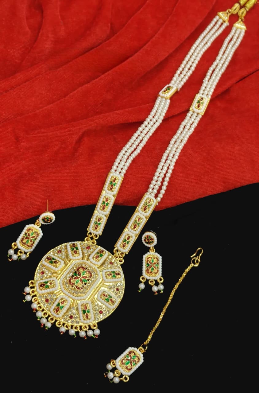 Designed as a long necklace with pendant, this Rajwadi necklace set pairs beautifully with Rajputi Poshak, Bandhani Lehenga, Gharchola Saree, and other Rajasthani traditional outfits. Its long length and royal design make it a statement jewelry piece that enhances your traditional look effortlessly.