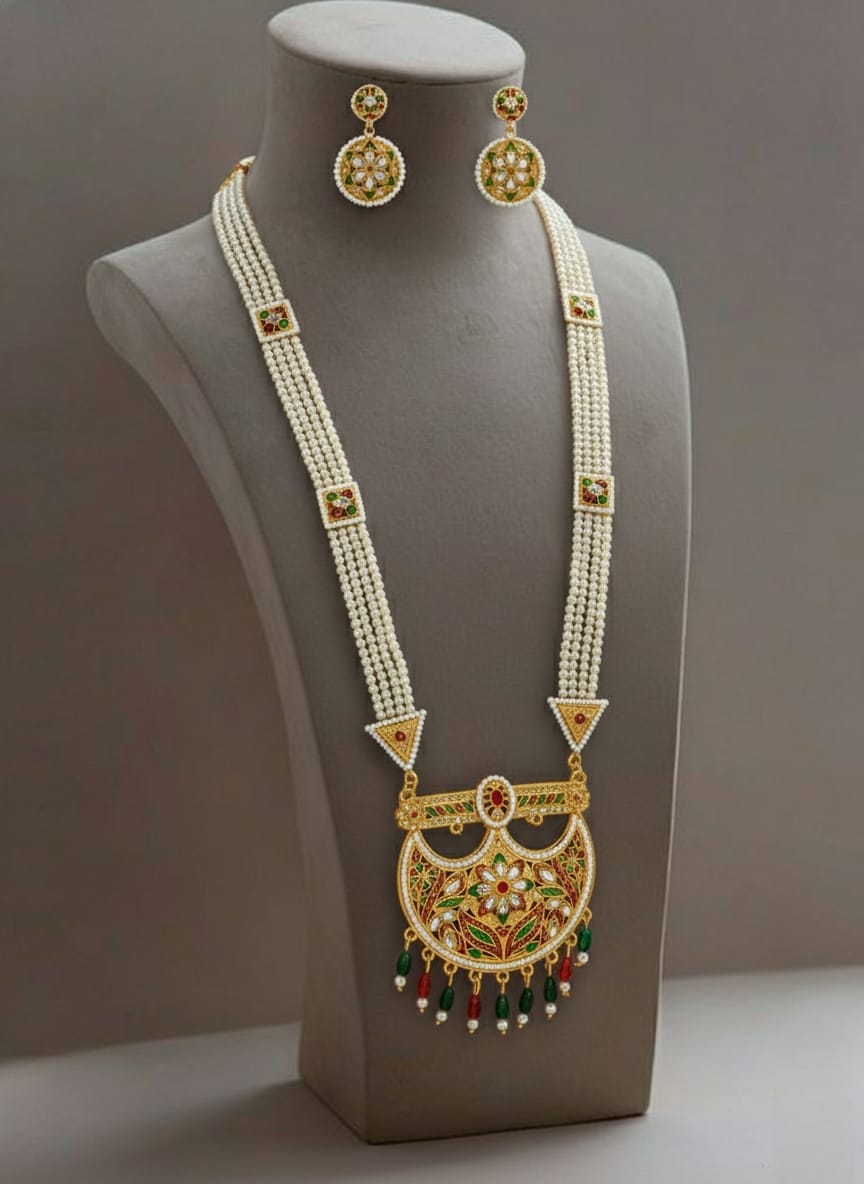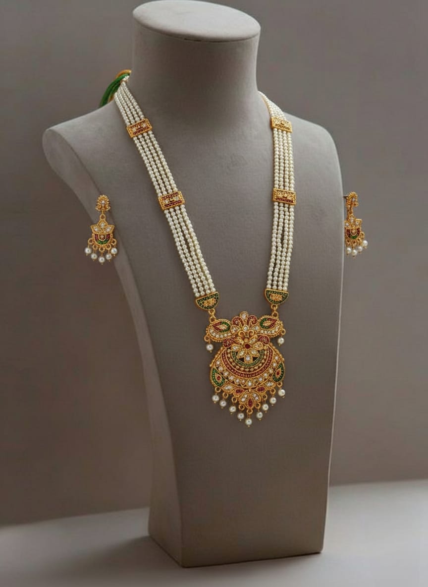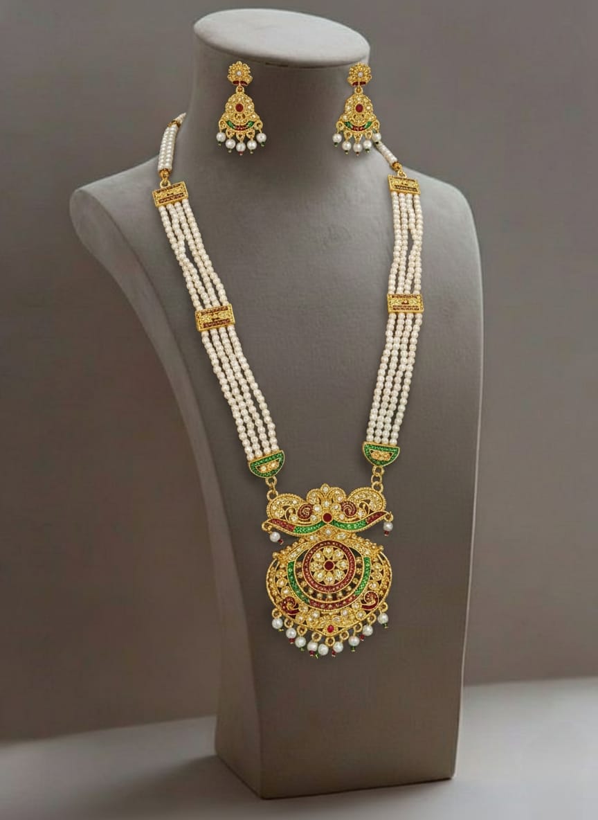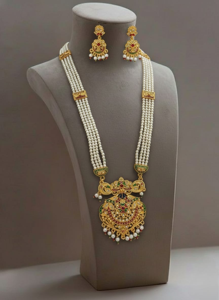 This Rajputi Rani Har necklace is crafted using high-quality pearls combined with durable alloyed metal, ensuring both elegance and long-lasting wear. The pearls are carefully arranged to create a rich layered effect, while the strong metal base provides comfort and stability during extended wear.
