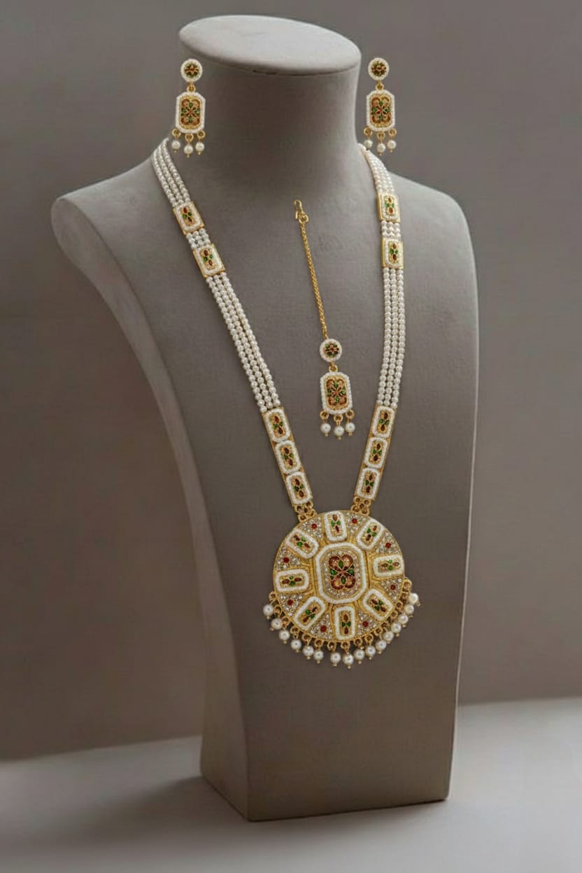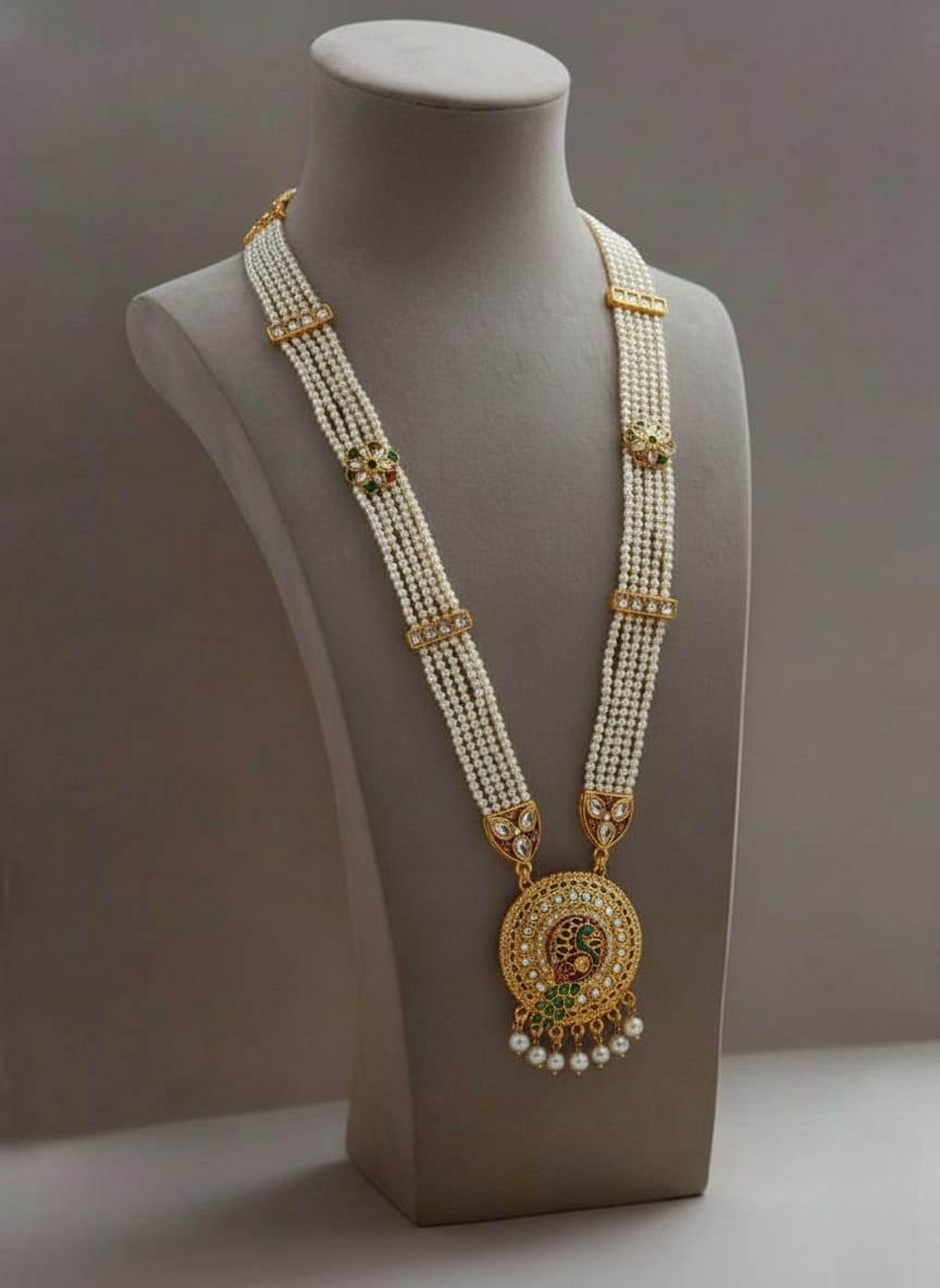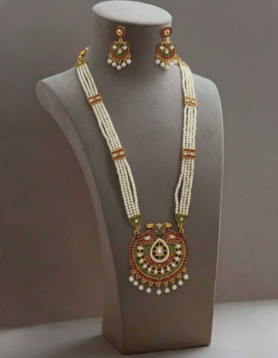 Add royal elegance to your traditional look with the Rajputi Rani Har with Peacock Design, a beautifully crafted Rajasthani long necklace set inspired by the timeless heritage of Rajputi queens. Featuring a graceful peacock motif, this necklace symbolizes beauty, prosperity, and royal charm, making it a perfect statement piece for special occasions