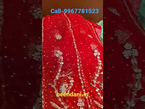 This red rajputi poshak with heavy zardosi work at Beendani Store is made with green and golden kundan work with flower design. There is heavy zardosi and kundan work done on lehenga, kurti-kanchali, and odhani. Hamrahi pure fabric used in this dark red colour poshak.
